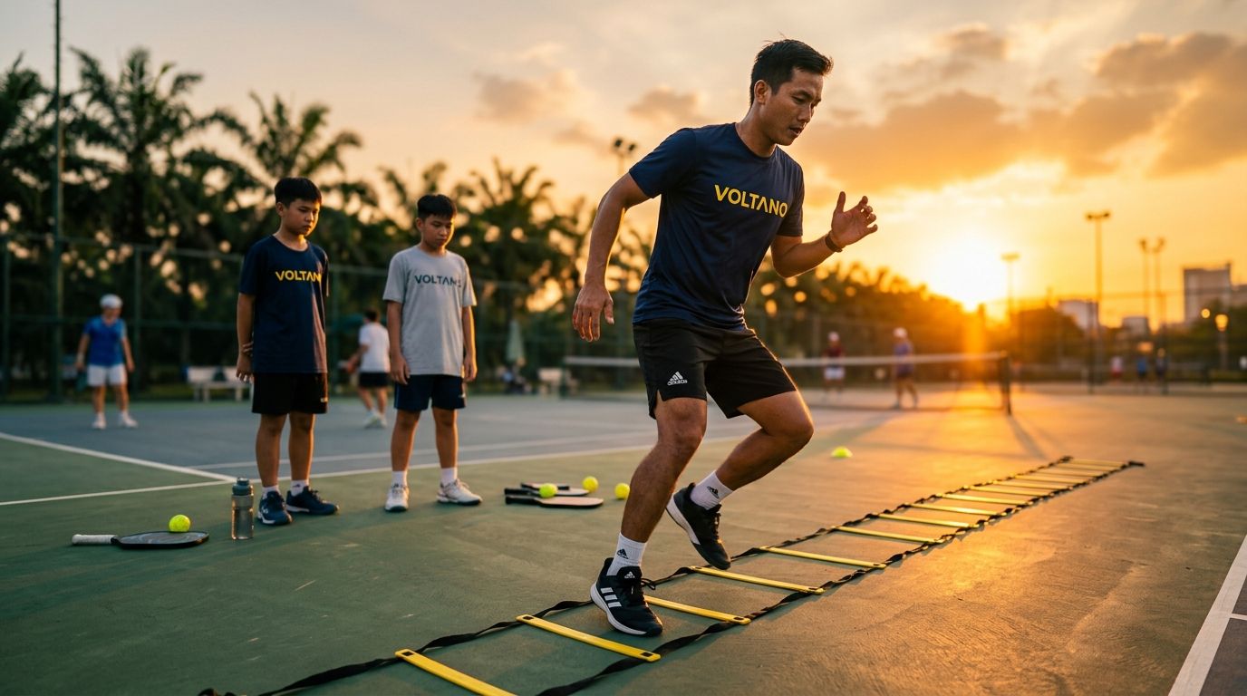Tốc độ di chuyển trên sân không phải là tốc độ chạy thẳng — đó là khả năng thay đổi hướng nhanh (agility), xuất phát nhanh từ trạng thái đứng yên, và phục hồi vị trí sau mỗi cú đánh. Dưới đây là các bài tập được HLV chuyên nghiệp khuyến nghị: